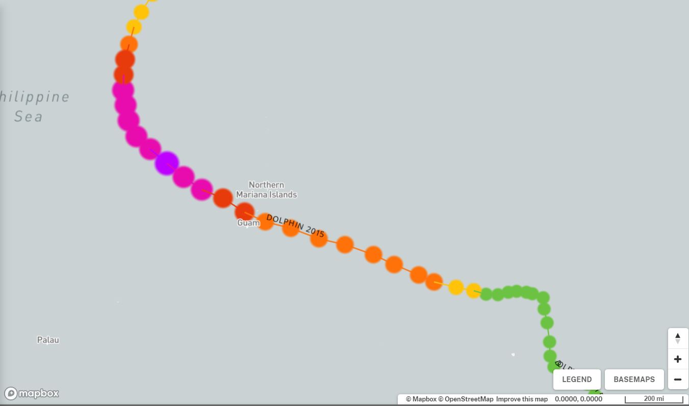 After going 13 years without typhoon-force winds, Guam was hit by Typhoon Dolphin on May 15, 2015. Dolphin passed between Guam and Rota, with maximum winds of 110 mph.